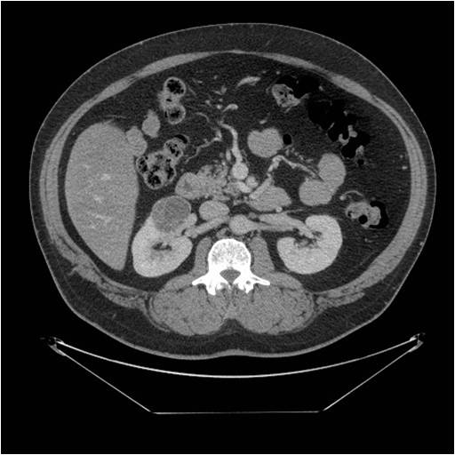 Single axial CT scan of the abdomen with IV contrast shows a mass within the right kidney with an enhancing capsule and enhancing internal septations.