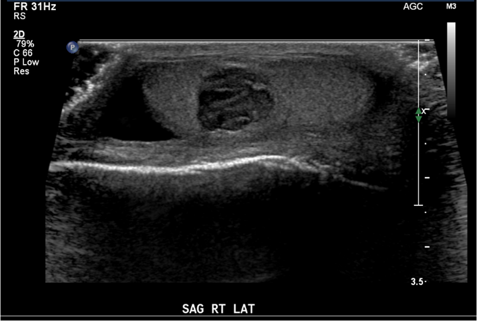 The differential for this lesion is broad, however, in the absence of trauma or symptoms of infection, benign and malignant neoplasms are considered. The diagnosis in this case was Leydig cell tumor, which is a tumor of the testicular interstitial cells and is categorized with Sertoli cell tumors as a gonadal stromal cell tumor. Leydig cell tumors are typically benign when less than 3 cm, and malignant when greater than 5 cm. They comprise 3% of all testicular tumors, and 90% of the time are benign.