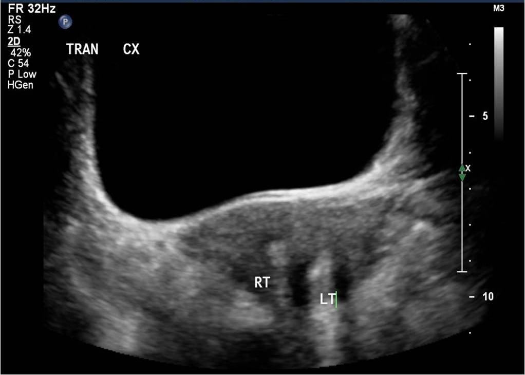 Uterine Didelphys: Transverse ultrasound image through the pelvis shows two separate widely splayed uterine horns, which may be seen in both uterine didelphys and bicornuate uterus.