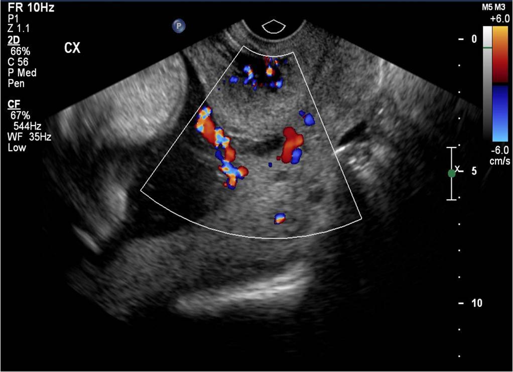 This is the ultrasound appearance of vasa previa. Vasa previa is when the umbilical cord vessels course across the internal cervical os, putting the patient and baby at risk for hemorrhage during delivery. Vasa previa is seen independently of placental and cord anomalies, as well as in cases of membranous cord insertion and succenturiate lobe placenta, where the placenta is split into two lobes and crossing fetal vessels are near the cervix.