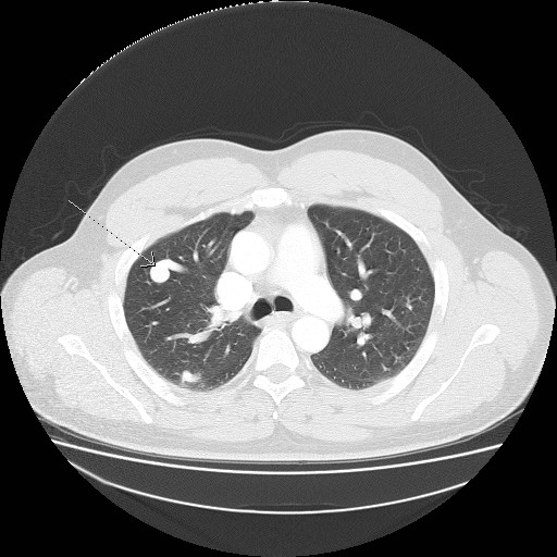 This is a case of pulmonary arteriovenous malformation, which is an abnormal communication between a pulmonary artery and pulmonary vein. Pulmonary arteriovenous malformations are typically round or oval shaped, and often a feeding artery and draining vein can be visualized. The differential diagnosis for this CT appearance includes pulmonary arteriovenous malformation carcinoid tumor, metastases, septic emboli, and solitary pulmonary nodule.