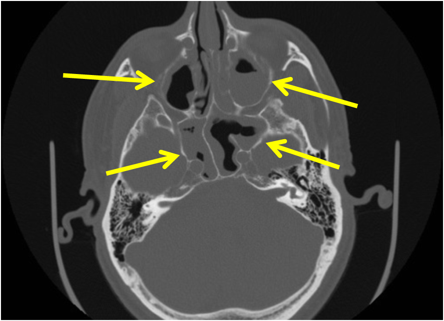 This is the appearance of acute sinusitis on CT. Sinusitis is inflammation of the sinuses as a result of infection with a virus, bacteria, or fungus. Usually patients do not need imaging for diagnosing sinusitis as it is diagnosed clinically by history and physical exam. However, sinusitis is frequently an incidental finding on head and maxillofacial imaging studies. On CT, features that suggest acute versus chronic sinusitis include air fluid levels and bubbly secretions, with a lack of underlying bony changes. Chronic sinusitis is diagnosed in the presence of underlying sclerosis of the bony walls of the sinuses.