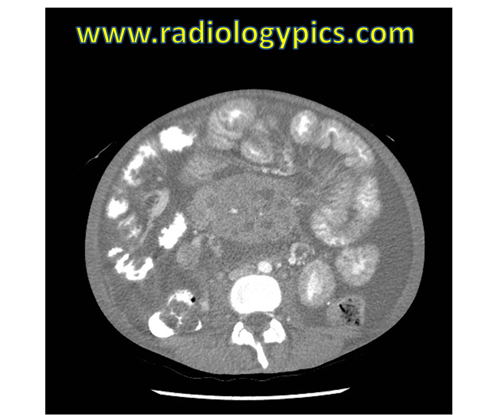 History: 30 year old female with HIV and abdominal pain. What is your differential diagnosis given the findings in this 30 year old female with a history of HIV and abdominal pain? Thank you to Paul Murphy, M.D. Ph.D. for these excellent images.