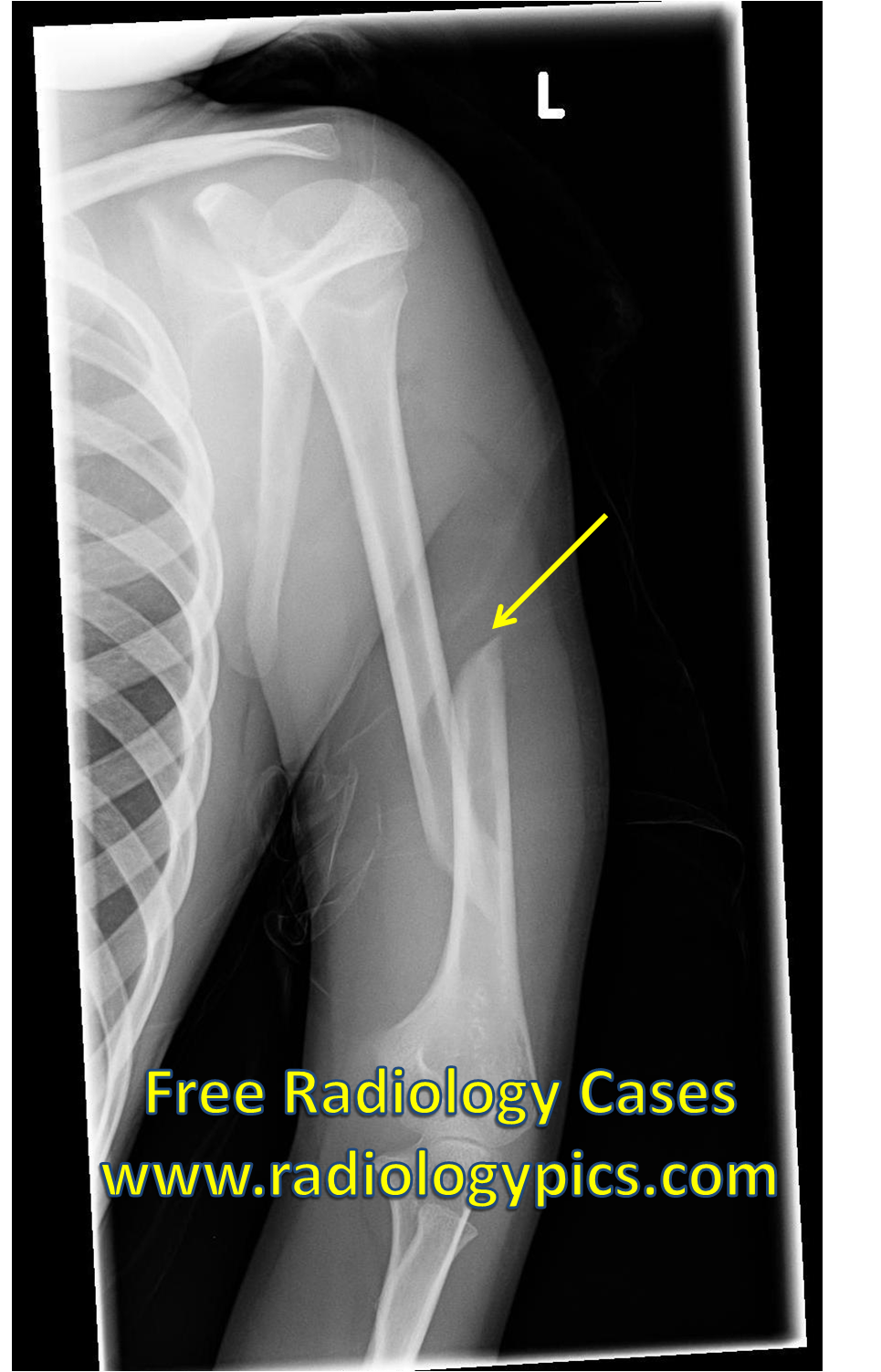 This is a left humeral diaphysis or humerus shaft fracture. In fractures of the humerus shaft it is imperative to assess for radial nerve injury. The radial nerve courses along the spiral groove of the humerus and can be damaged with humeral shaft fractures.