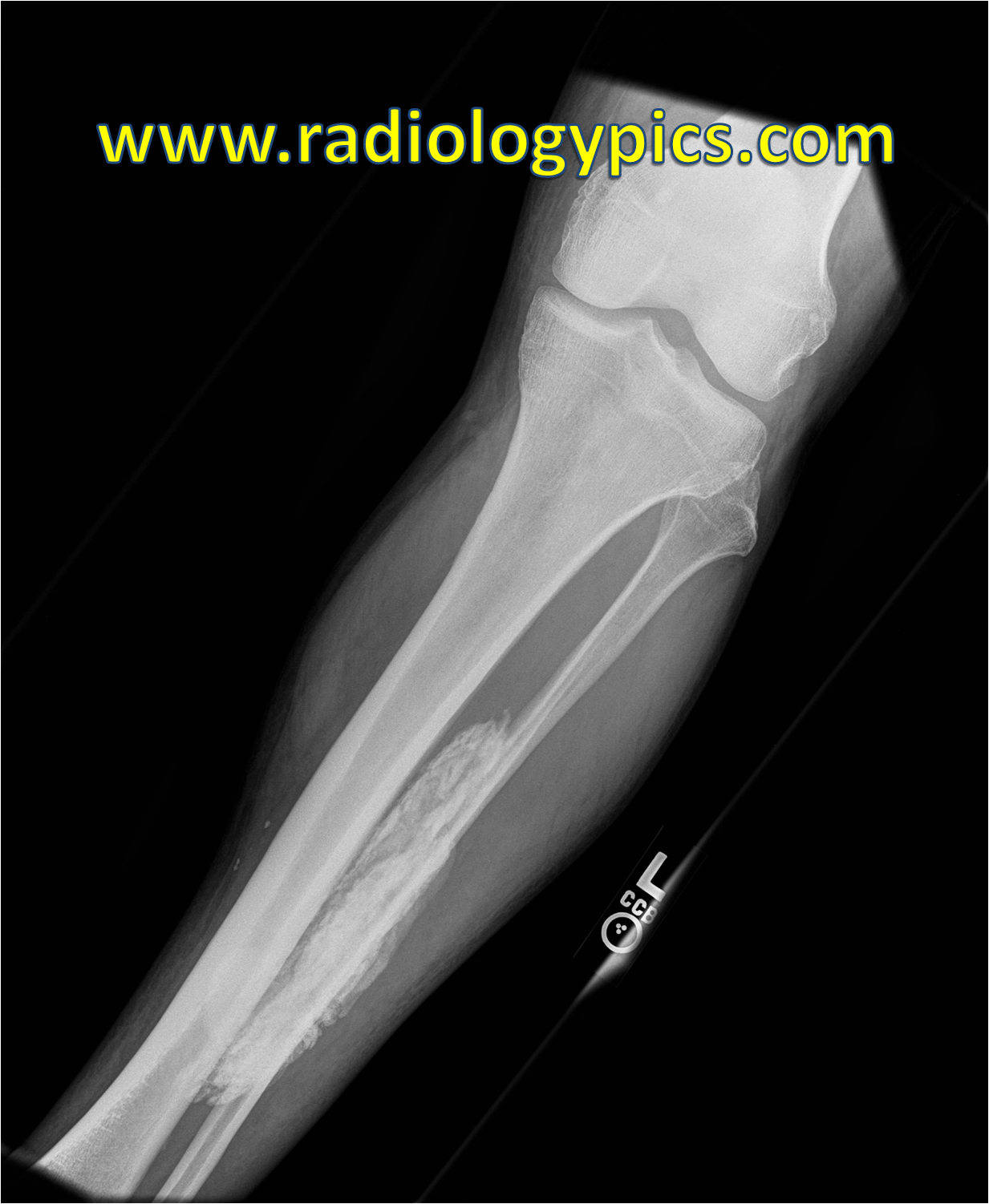 This is a case of calcific myonecrosis of the anterior tibialis muscle. Calcific myonecrosis is a rare late complication of compartment syndrome. This patient actually had a history of compartment syndrome 30 years earlier. The current understanding according to this article here is that compartment syndrome initially leads to necrosis and fibrosis, then continued hemorrhage into the muscle over time calcifies and forms a mass. Eventually this mass may herniate through the muscle and lead to the patient’s presenting symptoms of a mass in the leg or leg pain. Calcific myonecrosis occurs most commonly in the anterior compartment of the leg.