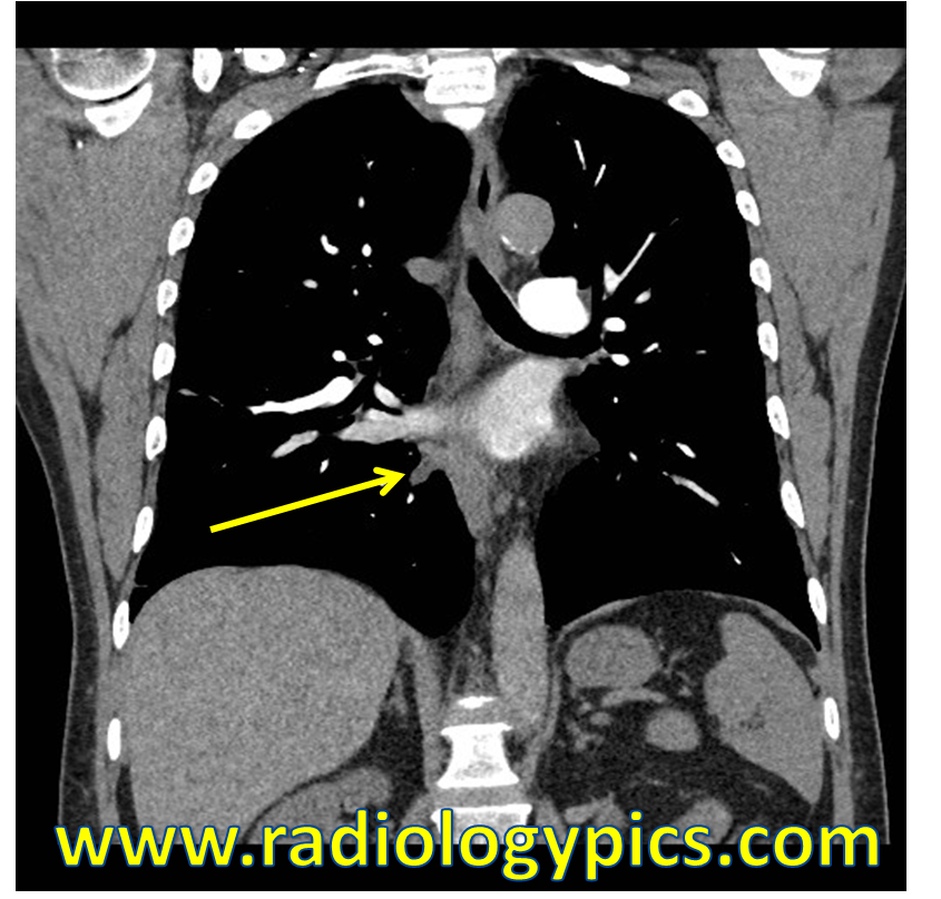 Esophageal Bronchus – Coronal CT of the chest with intravenous contrast reveals an abnormal bronchus arising from the distal esophagus feeding the medial basal segment of the right lower lobe.