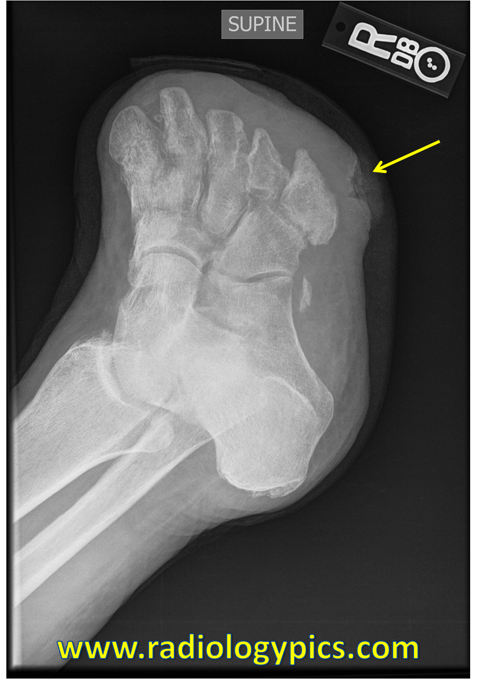 This is a common appearance in patients with uncontrolled diabetes and osteomyelitis of the foot. There are many muskuloskeletal complications of diabetes, most of which predominantly affect the feet. Most commonly is ulceration, cellulitis or abscess formation. Diabetic patient’s frequently develop peripheral neuropathy and therefore have difficulty detecting wounds and injuries when they first occur in their feet. Over time these wounds become infected. Radiographically they appear as seen in the image above at the yellow arrow. If left untreated, these soft tissue ulcers can lead to deeper infections that end up involving the underlying bone, eventually leading to osteomyelitis, or infection of the bone and bone marrow. Typically the patient is pain free due to their peripheral neuropathy.