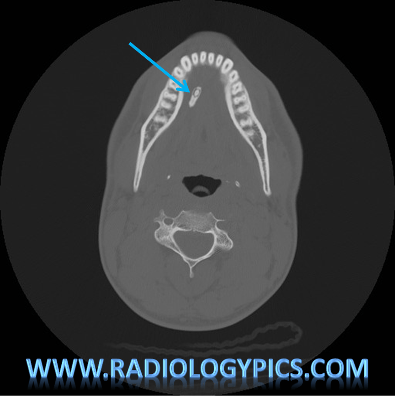 This is a pretty picture of a sialolith, which essentially is a calcified stone in a salivary gland duct. They most commonly form in the submandibular gland duct (Wharton’s duct) due to its long and upward going course. Sialolithiasis presents with pain and swelling of the involved gland, often every time the patient eats or even thinks about eating, as this stimulates salivation.