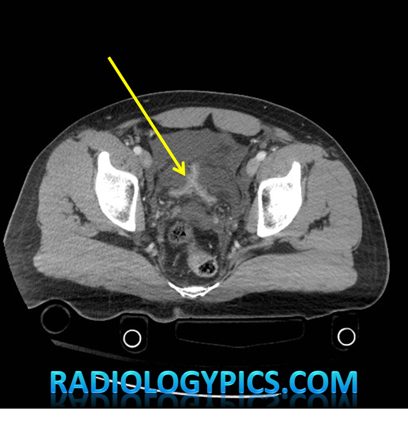 This is a case example of extraperitoneal bladder rupture. In the setting of trauma to the bladder it is important to differentiate extraperitoneal from intraperitoneal rupture. Intraperitoneal bladder rupture has to be repaired surgically, whereas extraperitoneal rupture can be treated conservatively with continuous drainage via foley catheter. Bladder rupture can also be classified into the following types: