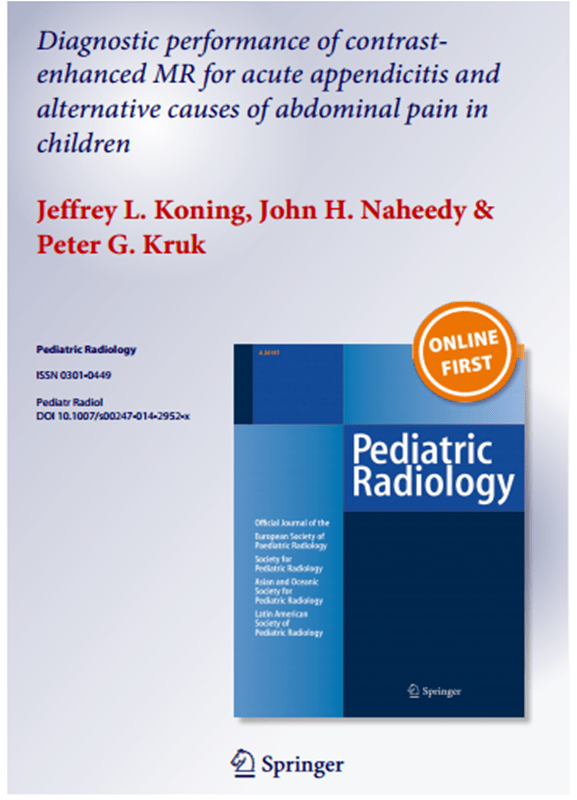 The past 9 months have been extremely busy and I haven’t been able to be as active as I would like on RadiologyPics.com, but now I can finally share why. With the help of my co-authors John H. Naheedy and Peter G. Kruk, we published an article in Pediatric Radiology entitled “Diagnostic Performance of Contrast Enhanced MR for acute appendicitis and alternative causes of abdominal pain in children.” You can access our article above at SpringerLink or on PubMed.