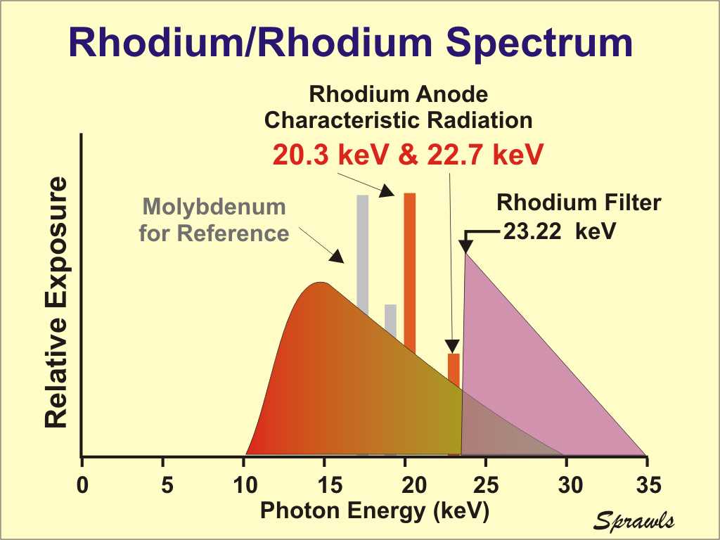 Other points to note are that the anode and filter can be changed depending on the density of the breast tissue. Always remember that for dense breasts, a rhodium anode/rhodium filter is a good combination because it results in a higher energy beam to penetrate the tissue, and you can NEVER combine a rhodium anode with a molybdenum filter! For more information on why that is, see the below figures. Their explanations can be found at Sprawls Educational Foundation.